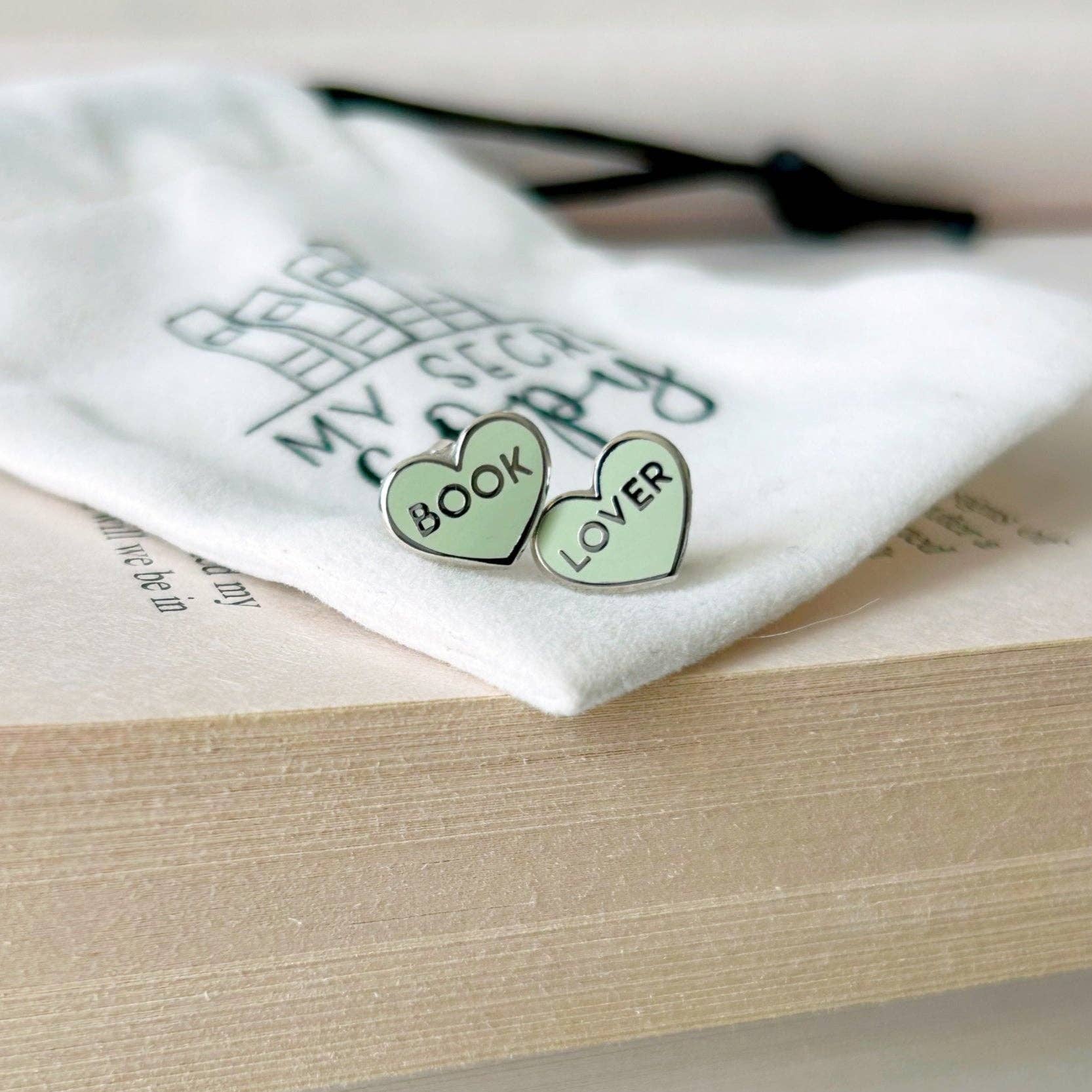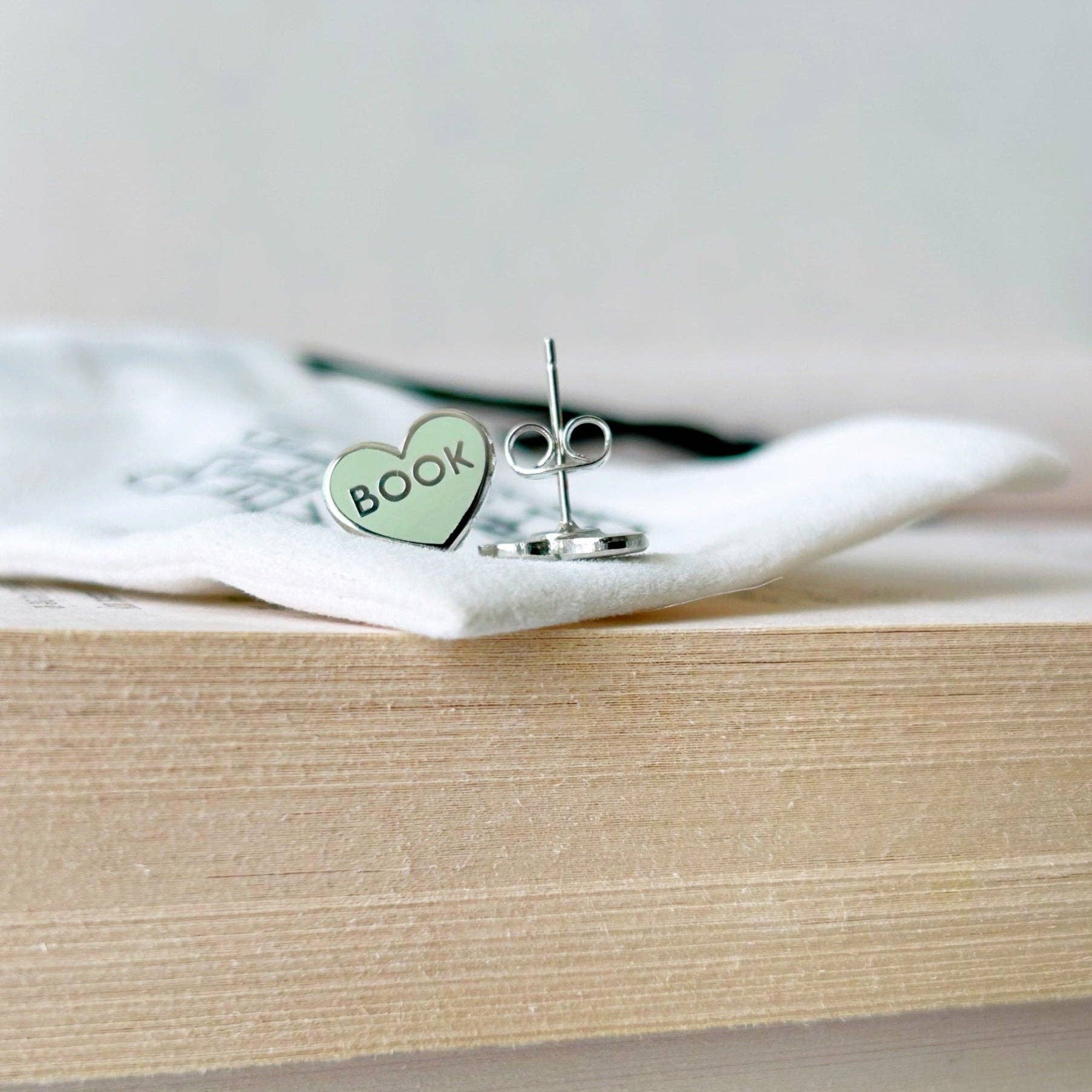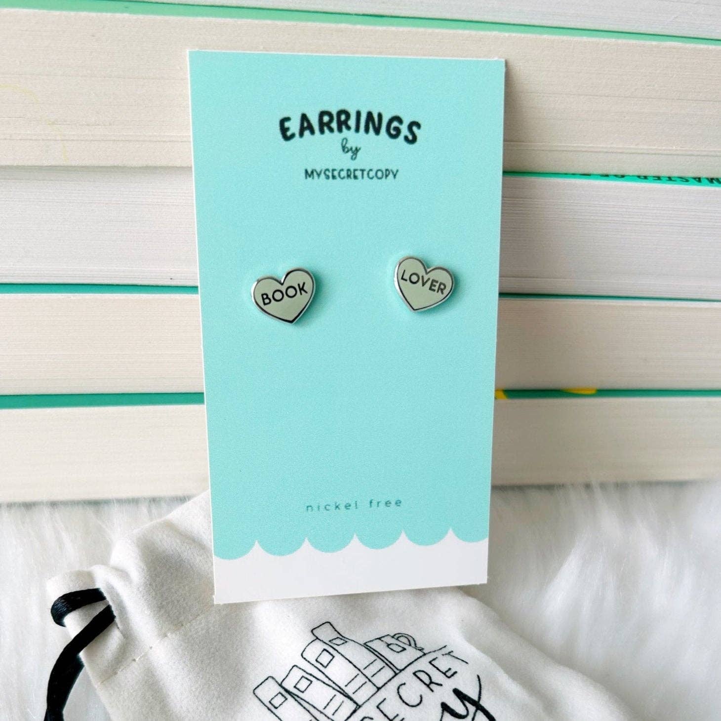 • Size: 11mm • Material: Nickel free silver plated brass • Left earring says "book" and right earring says "lover" • Comes packaged in a gift ready jewelry box