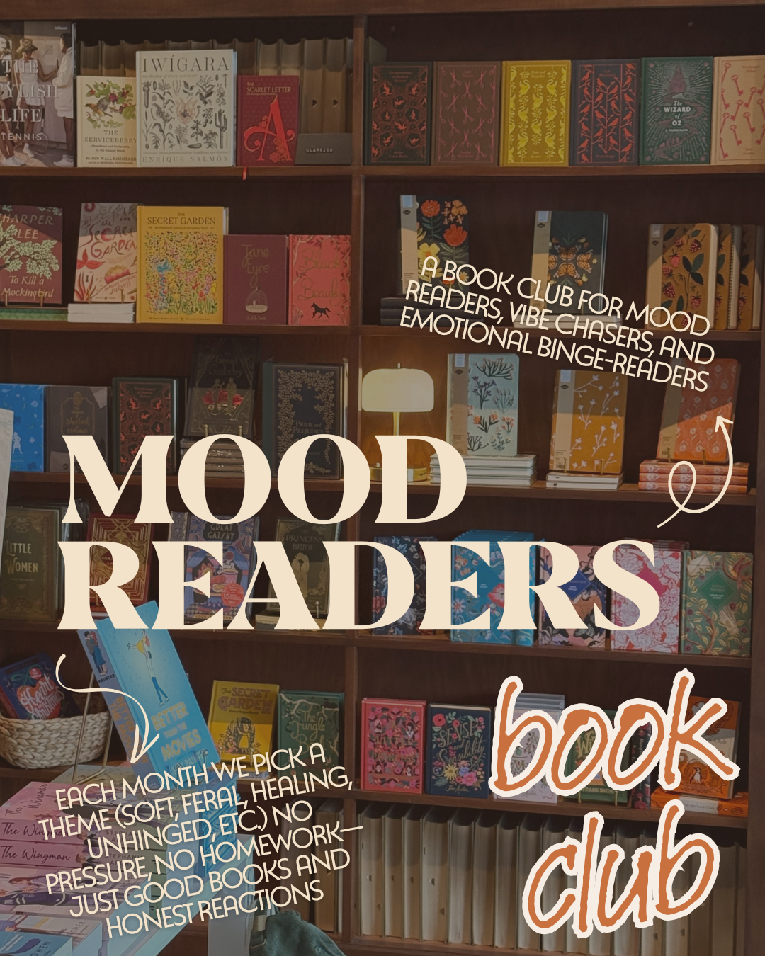 We are excited to launch a new book club, Mood Readers Book Club, hosted by our wonderful bookseller, Stephanie! This club is a book club for mood readers, vibe chasers, and emotional binge-readers. Each month we will pick a theme (soft, feral, healing, unhinged, etc.) and read accordingly. No pressure, no homework (beyond reading)—just good books, friendship, and honest reactions.